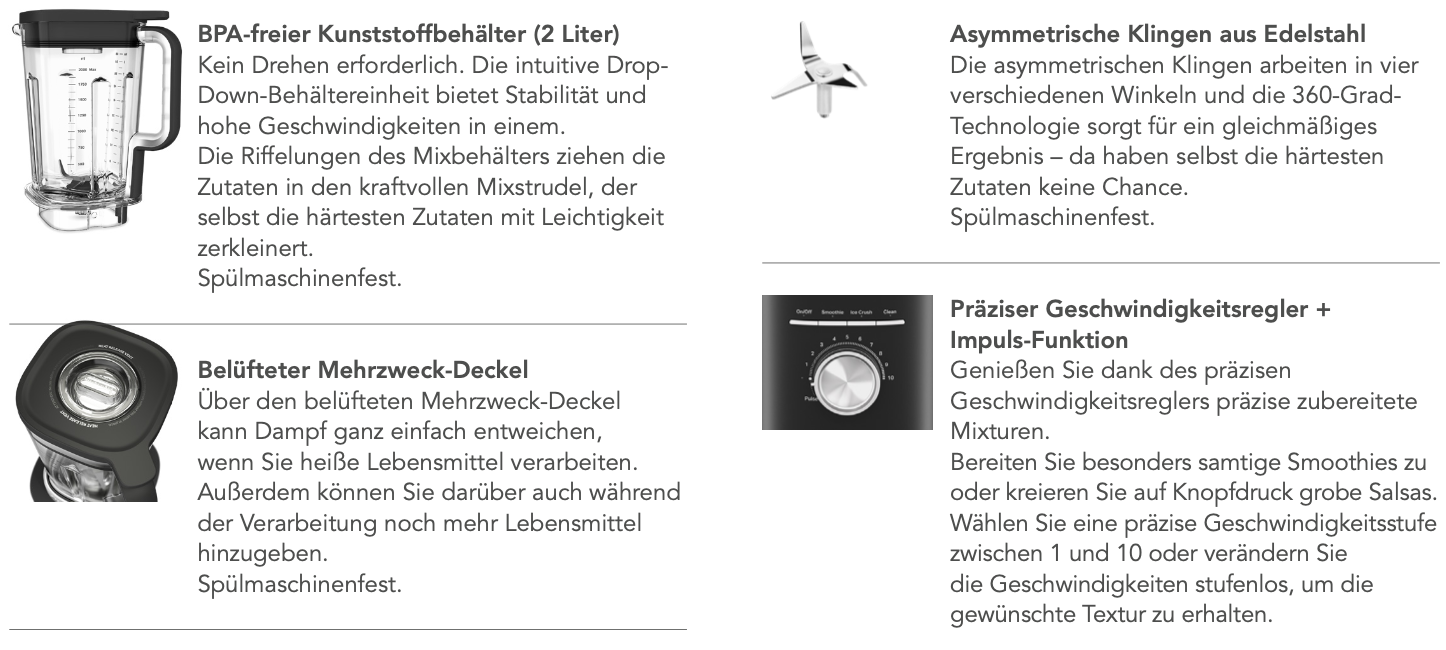 Mit dem leistungsstarken 3-teiligen Mix-System von KitchenAid können Sie selbst die härtesten Zutaten verarbeiten – ein leistungsstarker Motor, eine asymmetrische 360-Grad-Klinge und ein Behälter mit Riffelungen.